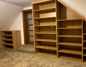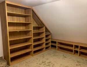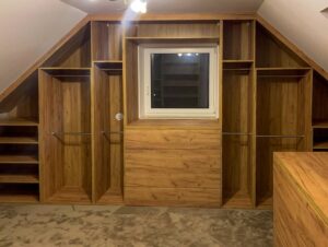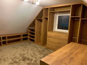 Przedstawiamy elegancką i w pełni dopasowaną garderobę wykonaną w nowoczesnym dekorze dąb złoty kraft. Cała przestrzeń została zaprojektowana i zagospodarowana co do centymetra, z pełnym wykorzystaniem skosów oraz trudniejszych fragmentów pomieszczenia.